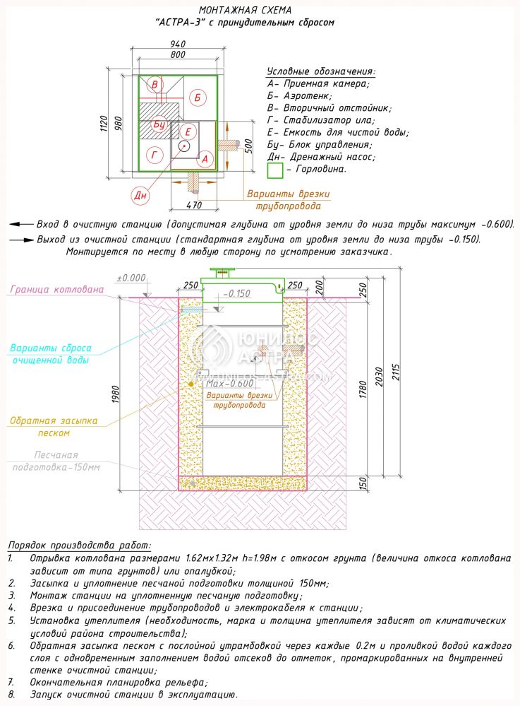 Процесс установки и монтажа Юнилос Астра 3ПР достаточно прост и не требует больших финансовых затрат. Это объясняется его габаритами и малым весом, которые позволяют осуществлять установку вручную. Каждый септик сопровождается рекомендациями производителя, которые нужно обязательно учитывать. Например, перед установкой необходимо определиться с местом его размещения, учитывая учесть расстояние от объекта поступления стоков и максимальную глубину врезки трубы. Затем необходимо подготовить место для сброса чистой воды или накопительный резервуар.